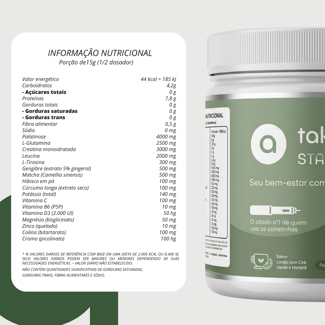 Palatinose (isomaltulose), L-glutamina, creatina monoidratada, L-leucina, gengibre em pó (Zingiber officinale, padronizado a 5% gingerol), extrato de chá verde (Camellia sinensis ∆ matcha), L-tirosina, colina bitartarato, bisglicinato de magnésio, ácido ascórbico (vitamina C), hibisco em pó (Hibiscus sabdariffa), cúrcuma longa (extrato seco), piridoxal 5-fosfato (vitamina B6), colecalciferol (vitamina D3), bisglicinato de zinco, picolinato de cromo, citrato de potássio, bicarbonato de potássio, aroma natural de limão com hortelã, acidulante ácido cítrico, edulcorante natural (glicosídeos de esteviol) e antiumectante dióxido de silício.